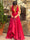 Simple Rose Red Deep V Neck Open Back A Line Long Evening Prom Dresses, PD0009