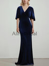 Elegant Mermaid Blue Velvet Half Sleeves Long Bridesmaid Dresses AB4241