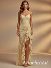 Sexy Yellow Floral Lace Ruffles Backless Prom Dress with Slit, Evening Dress, PD3823034